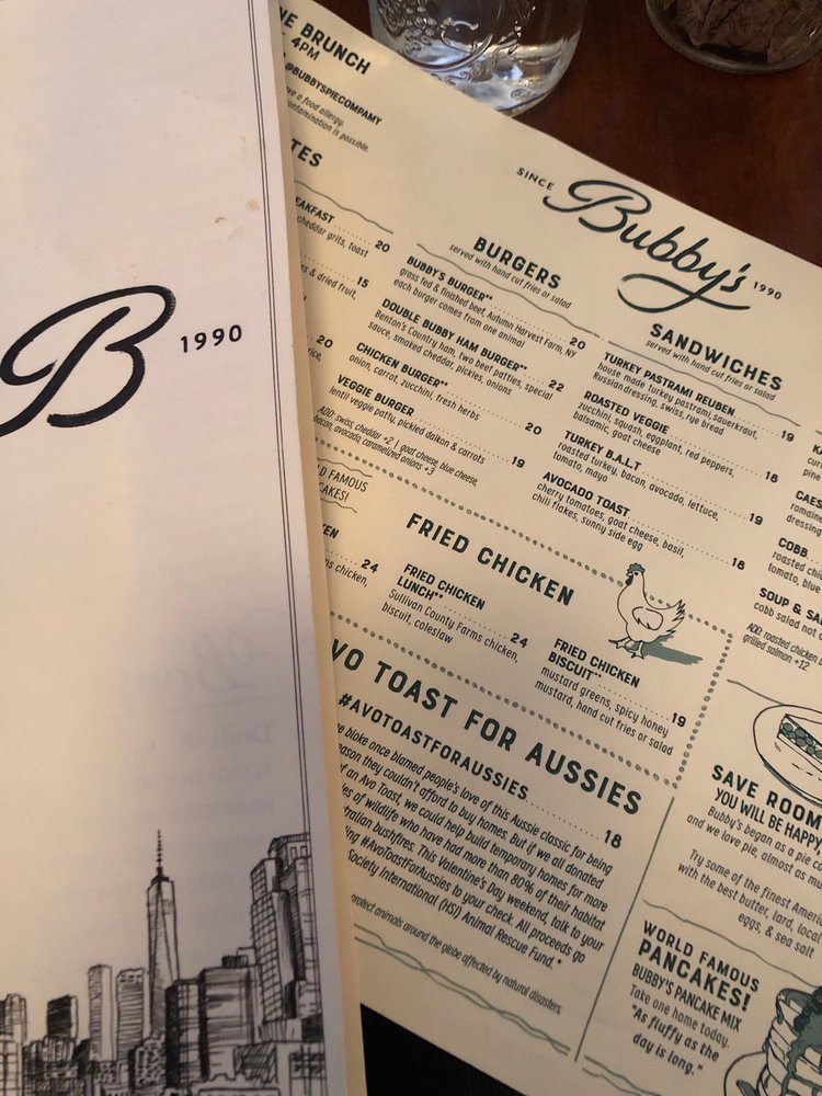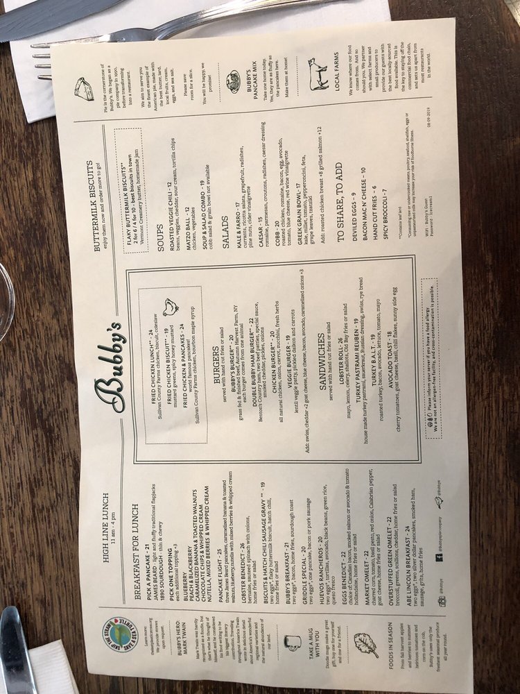 Bubby's High Line, an American restaurant located at 73 Gansevoort St in New York, offers a variety of options for breakfast, brunch, and lunch. The menu features items like Anson Mills Cheese Grits, Chicken Meatballs, and Pancakes with unique toppings like Nutella and Strawberries or Hawaiian fruits. Customers praise the delicious fried chicken, grits, and savory dishes like huevos rancheros. The cozy atmosphere, complete with music and crayons for all ages, adds to the overall dining experience. While tables may be close together to accommodate the crowds, the wait is worth it for the quality food and Mimosa flights. Bubby's is a must-visit spot for breakfast enthusiasts looking for homemade dishes and excellent customer service.